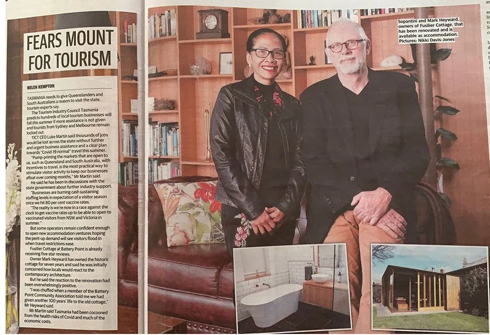 Owners, Mark Heyward and Sopantini welcomed guests. Alex Heroys, CEO of Destination Southern Tasmania introduced the event, speaking about how important it is for businesses like Fusilier Cottage to be showing confidence in difficult times. And the event was covered in Win News Tasmania, and the Hobart Mercury.